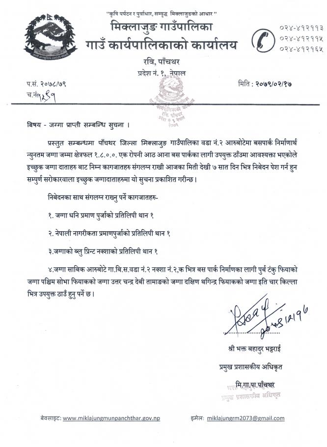 जग्गा प्राप्ति सम्वन्धि सूचना ।