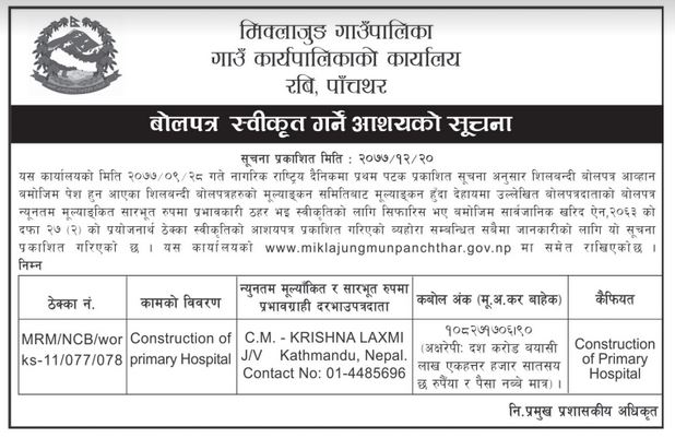 » बाेलपत्र स्वीकृत गर्ने आशयको सुचना ।
