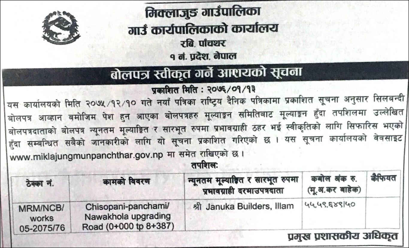 बाेलपत्र स्वीकृत गर्ने आशयको सूचना ।