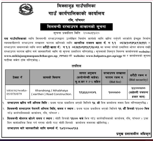 चालु आ.व.०८२।८३ को समपुरक अनुदान आयोजना निर्माण कार्यहरुको बोलपत्र ठेक्का आव्हान सूचना ।