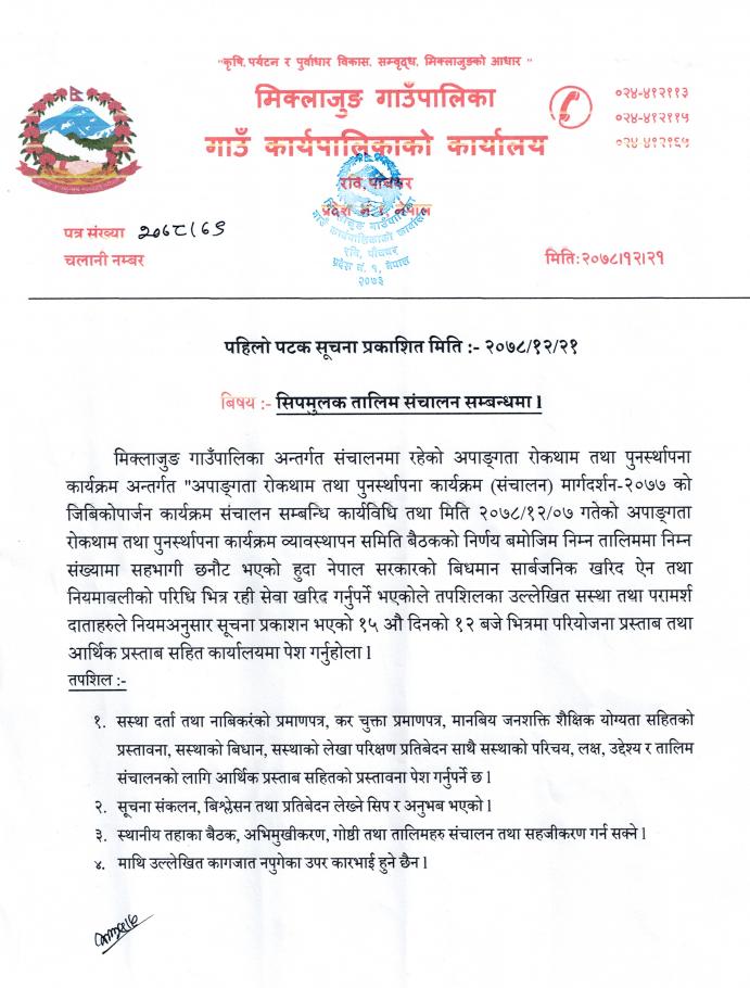 पोषण सुधार कार्यक्रम (विशेष अनुदान योजना) क्रियाकलापहरुको ठेक्का आव्हानको सूचना ।